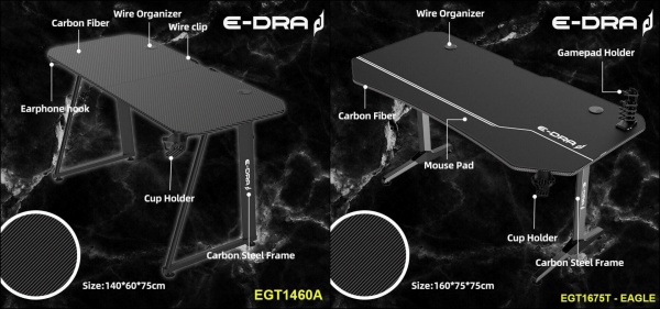 Thực tế người dùng bàn gaming cũng có nhiều nhu cầu khá đa dạng, nắm bắt xu thế sử dụng E-Dra gần đây đã tung ra 6 bộ bàn gaming với thiết kế khác nhau phù hợp với nhiều vị trí kê “góc game thủ”. Danh sách 6 cái tên này bao gồm EGT1460A, EGT1460R – Blade, EGT1460T – Eagle, EGT1610AL, EGT1610AR và EGT1675T Eagle.